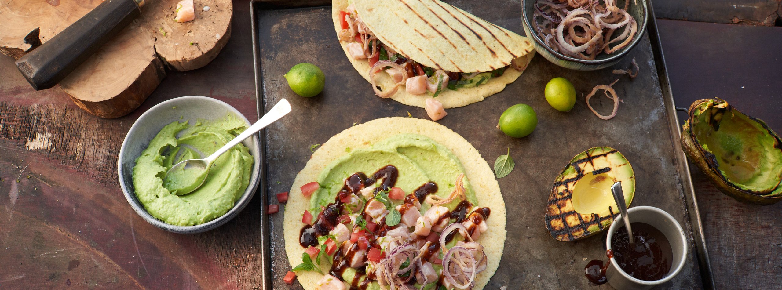 Tacos auf einer Seite auf dem Grill kurz anrösten, dann mit Avocadopüree bestreichen und mit Ceviche, Tomatenwürfeln, Minze sowie Knusper-Zwiebeln belegen. Anschließend mit der restlichen BBQUE Sauce beträufeln, zusammenklappen und sofort servieren.